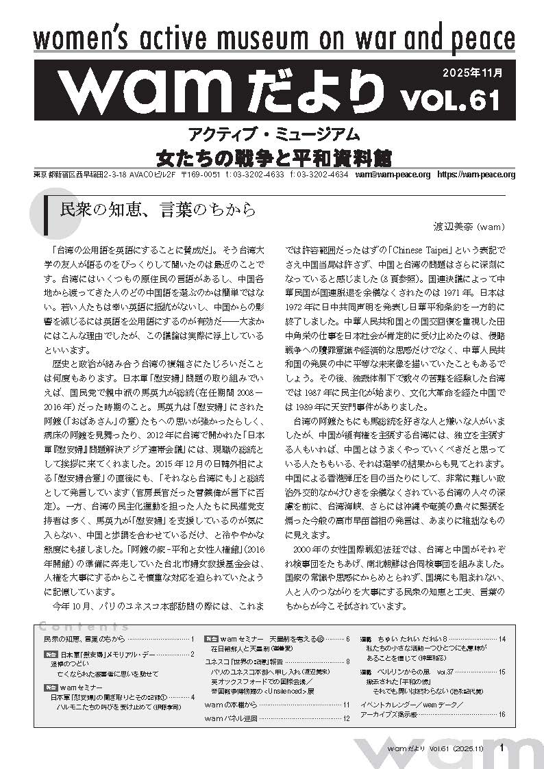 2000年の女性国際戦犯法廷では、台湾と中国がそれぞれ検事団をたちあげ、南北朝鮮は合同検事団を組みました。国家の常識や思惑にからめとられず、国境にも阻まれない、人と人のつながりを大事にする民衆の知恵と工夫、言葉のちからが今こそ試されています。